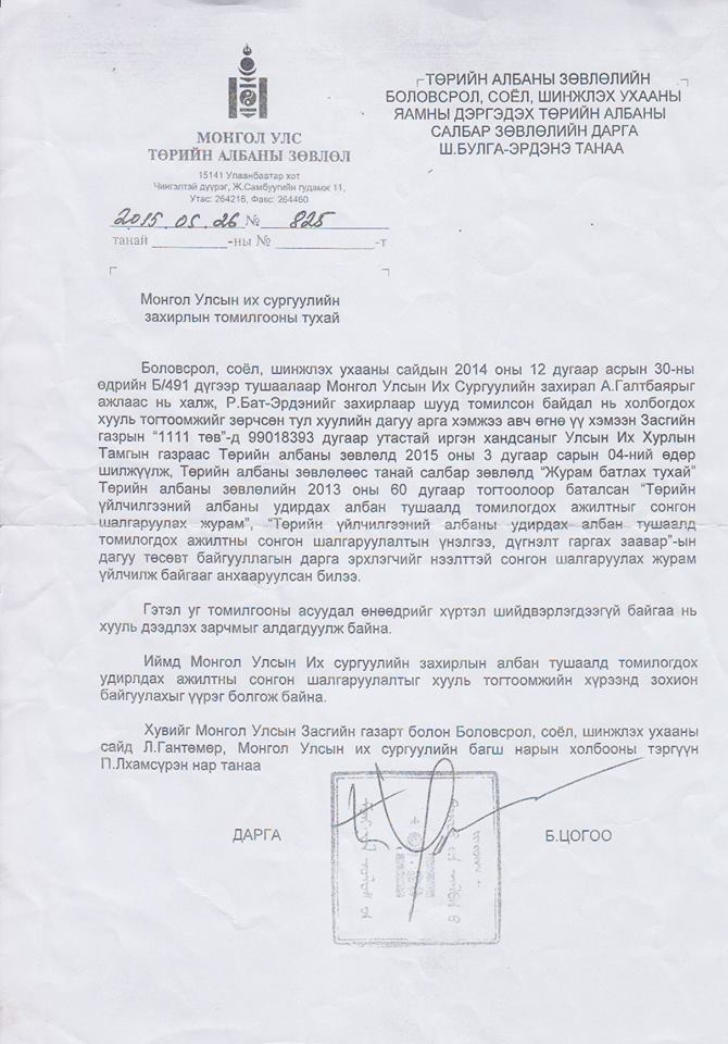 Тэгвэл энэ асуудлыг Төрийн албаны зөвлөл хууль бус гэдгийг дахин баталсан байна. Үүнийг ТАЗ-ын дарга Б.Цогоогийн газрын үсэгтэй энэхүү албан бичиг батална.