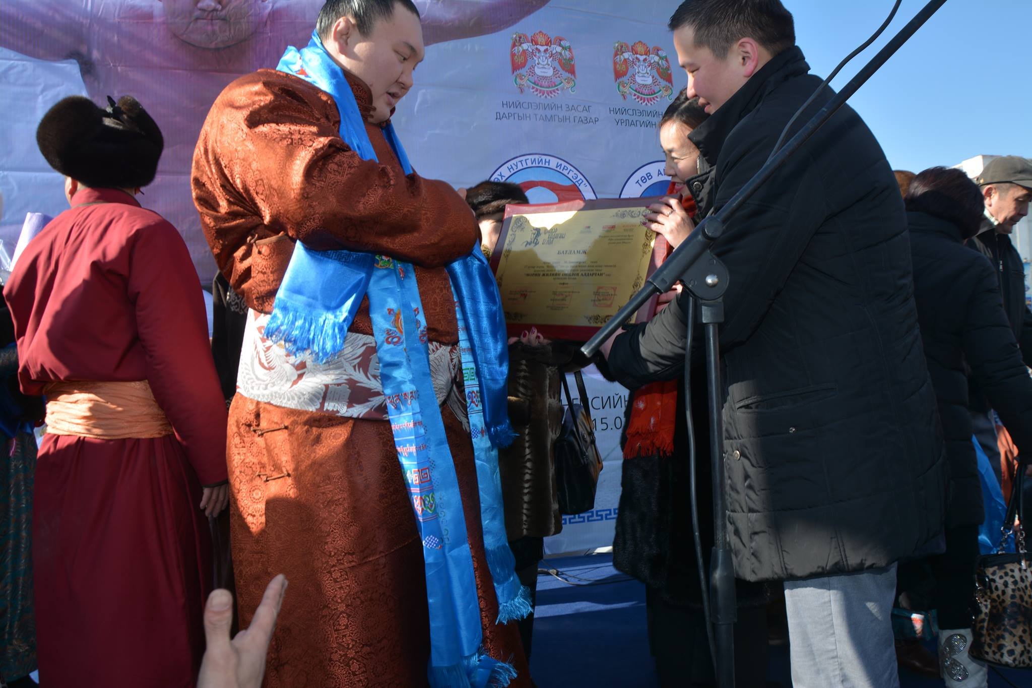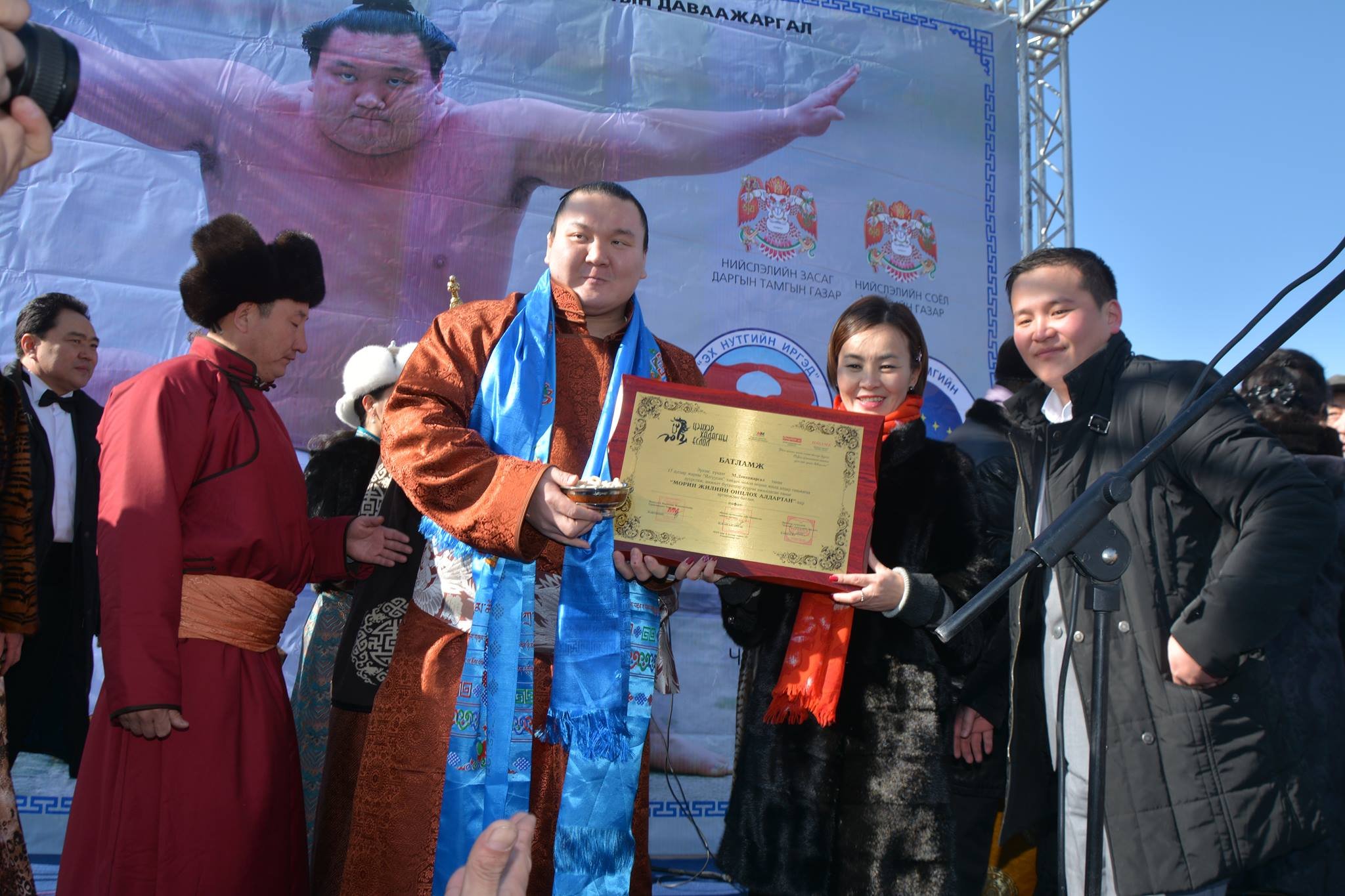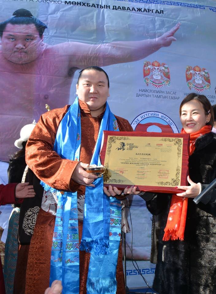 Монгол Улсын гавьяат тамирчин, Японы мэргэжлийн сүмогийн 69 дэх их аварга Мөнхбатын Даваажаргалд Монгол Улсын Хөдөлмөрийн Баатар цол олгов. Нийслэлийн иргэд Их эзэн Чингисийн талбайд аваргадаа хүндэтгэл үзүүллээ. Их эзэн Чингисийн талбайд болсон хүндэтгэлийн арга хэмжээний үеэр Монголын Маркетинг Менежментийн Хүрээлэн, Шилэн мэдээллийн сайт Онцлох.мн, "Элеганс” сэтгүүлийнхэн ЦЭНХЭР ХАДАГНЫ ЁСЛОЛ-д хүрэлцэн ирж амжаагүй "Морин жилийн онцлох алдартан” батламжийг нь гардуулсан. Хөдөлмөрийн баатар цол хүртсэн М.Даваажаргал аварга энэхүү шагналыг ихэд билэгшээсэн юм.