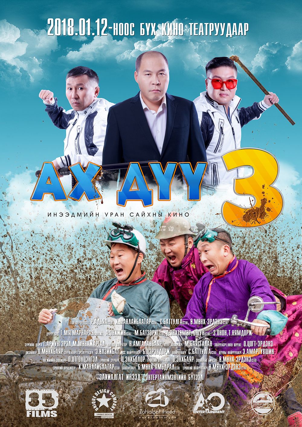90 минут үргэлжлэх бүрэн хэмжээний "Ах дүү гурав" уран сайхны киноны зохиолыг бичиж найруулсан Ө.Мөнх-Эрдэнэ, продюсер Х.Манлайбаатар, 2-р найруулагч С.Баттулга, гол дүр болох ах дүү гуравт Захиалгат Инээд хамтлагийн Мөөжиг, Манлай, Адъяа. Аавын дүрд АЖ Г. Мягмарнаран тоглож, жүжигчин О.Оюун, Х-ТҮЦ-ийн Онон, Шинэ үеийн Энхжин, Приүсийн босс киноны Батзориг, Нямдорж гэх мэтчилэн олон танил жүжигчид тоглосон байна.