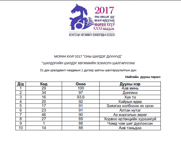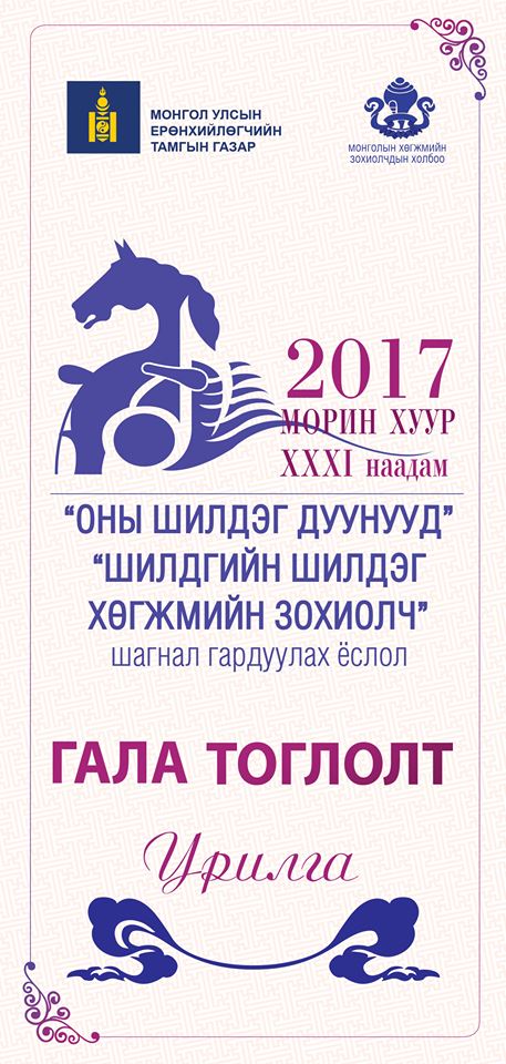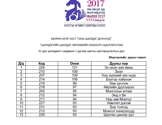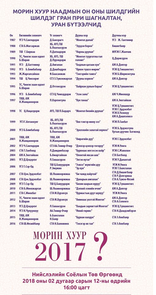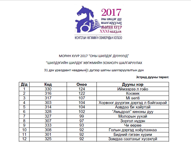 Монголын хөгжмийн зохиолчдын холбоо, МҮОНТВ хамтран зохион байгуулдаг оны шилдэг дуунууд шалгаруулах "Морин хуур-2017” наадмын шилдэгүүд тодрох торгон агшин ойртлоо. Уг наадмыг гурван үе шаттайгаар зохион байгуулж байгаа бөгөөд эхний шалгаруултад 100 гаруй бүтээлээс мэргэжлийн дууны төрөлд 13, нийтийн дууны төрөлд 10 дуу, эсртадын төрөлд 12 дуу шалгарсан юм.
