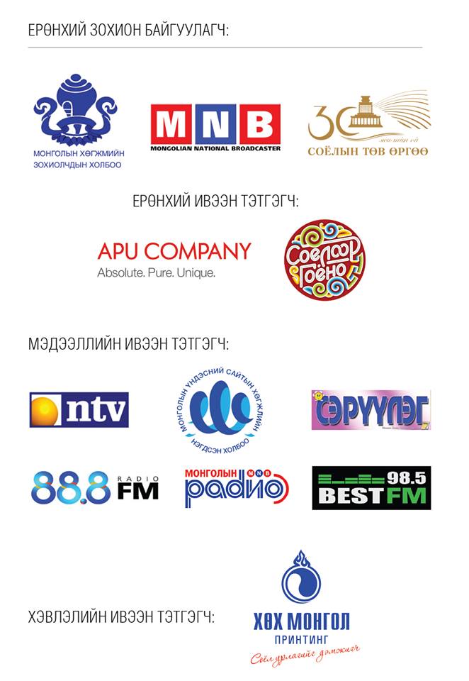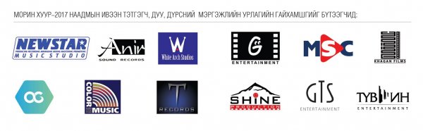 "Морин хуур 2017” наадмыг зохион байгуулахад ерөнхий ивээн тэтгэгчээр :"СОЁЛООР ГОЁНО" "APU COMPANY" хамтран зохион байгуулагч: " МҮОНТВ" "СОЁЛЫН ТӨВ ӨРГӨӨ хэвлэлийн ивээн тэтгэгч: Соёл урлагийг дэмжигч "ХӨХ МОНГОЛ ПРИНТИНГ" мэдээллийн ивээн тэтгэгч "МОНГОЛЫН РАДИО" ,"NTV" "BEST FM 98.5", "Мэдээ мэдээлэл радио 88.8" "МОНГОЛЫН ҮНДЭСНИЙ САЙТЫН ХӨГЖЛИЙН НЭГДСЭН ХОЛБОО"ны нийт хамт олон, болон ивээн тэтгэж хамтран ажилласан дуу дүрсний урлагийн гайхамшигийг бүтээгч "NEWSTAR STUDIO ", "ANIR STUDIO" ," WHITE ARCH STUDIO LLC","COLOR MUSUC", "OCEANGREY", "T RECORDS" , "G ENTERTAIMENT", "HAGAN" "MSC" "SHINE" STUDIO "TUVSHIN" STUDIO "GTS" STUDIO - ийн нийт хамт олон, мөн "БСШУСЯ" "Засгийн газрын хэрэгжүүлэгч агентлаг соёл урлагийн газар,"Засгийн газрын хэрэгжүүлэгч агентлаг оюуны өмч,улсын бүртгэлийн ерөнхий газар" "СУИС", "Монголын зохиолчдын эвлэл", "МОSСАР" НАРМОН ХХК", "МОНГОЛ КОНТЕНТ ХХК" БАТЗҮҮ ХХК" "ГАНАА АРТ СТУДИ ХХК" "Sound of mongolia llc", "КАЖУГ" брэнд " УЛСЫН ФИЛАРМОНИЙН" нийт хамт олон зэрэг олон арван байгууллагууд сэтгэл санаагаа нэгтгэж, сар шинийн өмнө зохион байгуулагдаж байгаа хамгийн том гала тоглолт юм.