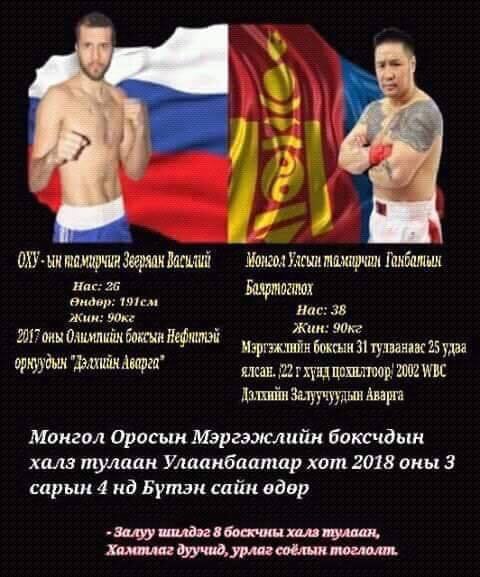 Монгол Оросын мэргэжлийн боксчдын халз тулаан ирэх гуравдугаар сарын 4-ны өдөр Улаанбаатар хотноо болох гэж байна. Халз тулаад ОХУ-ын тамирчин Зверяан Василий, МУ-ын тамирчин Ганбатын Баяртогтох нар тулалдахаар болжээ. ОХУ-ын тамирчин Зверяан Василийгий хувьд 25 настай, 90 кг-ын жинд тулалдах бөгөөд 2017 оны Олимпийн боксын Нефттэй орнуудын дэлхийн аварга юм. Харин манай тамирчин Ганбатын Баяртогтох 38 настай, мөн 90 кг-ын жинд тулалдах бөгөөд мэргэжлийн боксын рингэнд 29 удаа тулалдахдаа 23 ялж, таван удаа ялагдаж, нэг тэнцсэн тамирчин юм. Улмаар 23 ялалтын 20-д нь хүнд цохилтоор өрсөлдөгчөө ялсан байдаг.