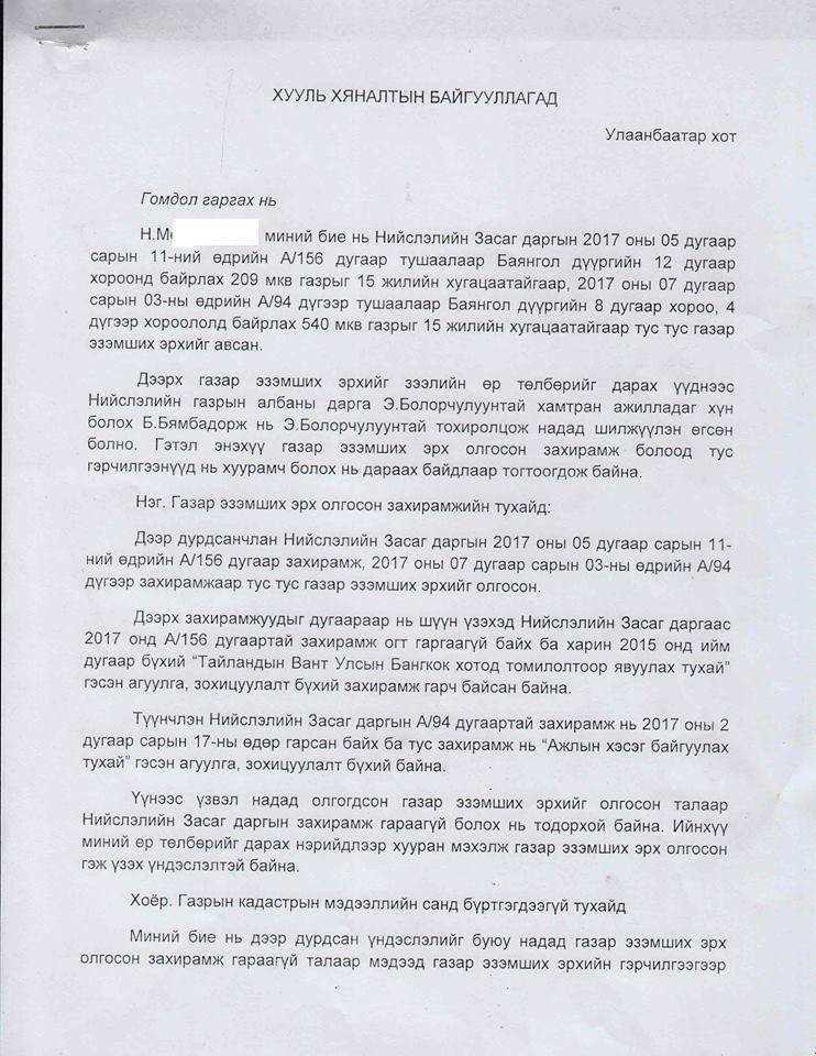 Иргэн М-ын гаргасан гомдлоос харахад НГА-ны дарга Э.Болорчулуун болон түүний хамтрагч Б.Бямбадорж нар газар эзэмшүүлэх тухай Нийслэлийн Засаг даргын гаргаагүй захирамжийг үндэслэн, холбогдох бчиг баримтыг хуурамчаар үйлдэн, Газрын кадастрын санд бүртгэгдээгүй "хуурамч газар эзэмшлийн гэрчилгээг” Иргэн М-ын өр төлбөрийг барагдуулах, түүнд хотын төвд газар олгосон нэрээр хувьдаа мөнгө олох зорилгоор олгож, хууль бус үйлдэл хийсэн гэж үзэх үндэслэл харагдаж байна.