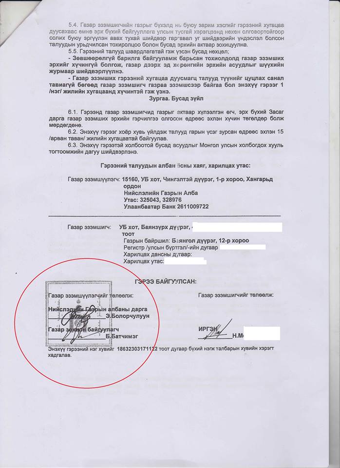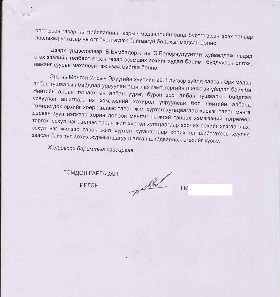 НГА-аас үүнийгээ баталгаажуулж 2017 оны 05 сарын 26-ны өдөр Баянгол дүүргийн 12-р хороонд байрлах 209 мкв газрыг иргэн М-д эзэмшүүлэх гэрээг НГА-ны дарга Э.Болорчулуун, Газар зохион байгуулагч Б.Батчимэг нар гарын үсгээ зурж, НГА-ны тамга тэмдгийг дарж байгуулан, газар эзэмших №000680724 тоот НГА-ны дарга Э.Болорчулууны гарын үсэгтэй гэрчилгээ гарчээ.