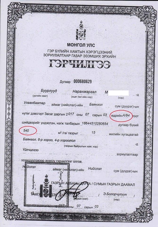 2017 оны 07 сарын 03-ны өдөр иргэн М-ын нэр дээр Нийслэлийн Засаг даргын А/94 дүгээр тоот захирамжид үндэслэн Баянгол дүүргийн 8-р хороо, 4-р хороололд байрлах 540 мкв газрыг 15 жилийн хугацаатайгаар эзэмшүүлэх №000680629 тоот хоёрдох газрын гэрчилгээ гарчээ.