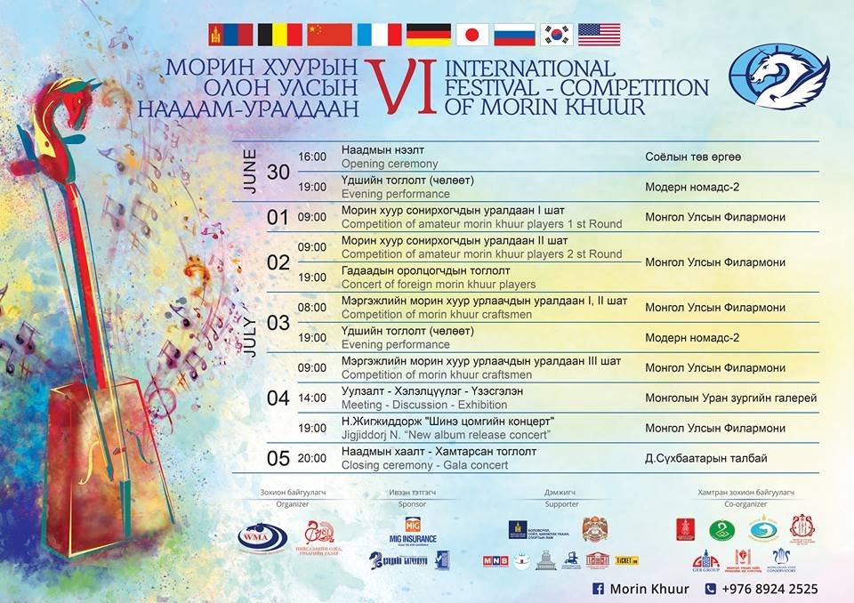 Тус олон улсын наадам "Мэргэжлийн морин хуур урлаачдын уралдаан”, "Морин хуур сонирхогчдын уралдаан”, "Гадаад морин хуурчдын тоглолт”, "Уулзалт-хэлэлцүүлэг”, "Үзэсгэлэн” гэсэн төрлөөр 06 дугаар сарын 30-наас 07 дугаар сарын 05-ны өдрүүдэд зохион байгуулагдах юм.