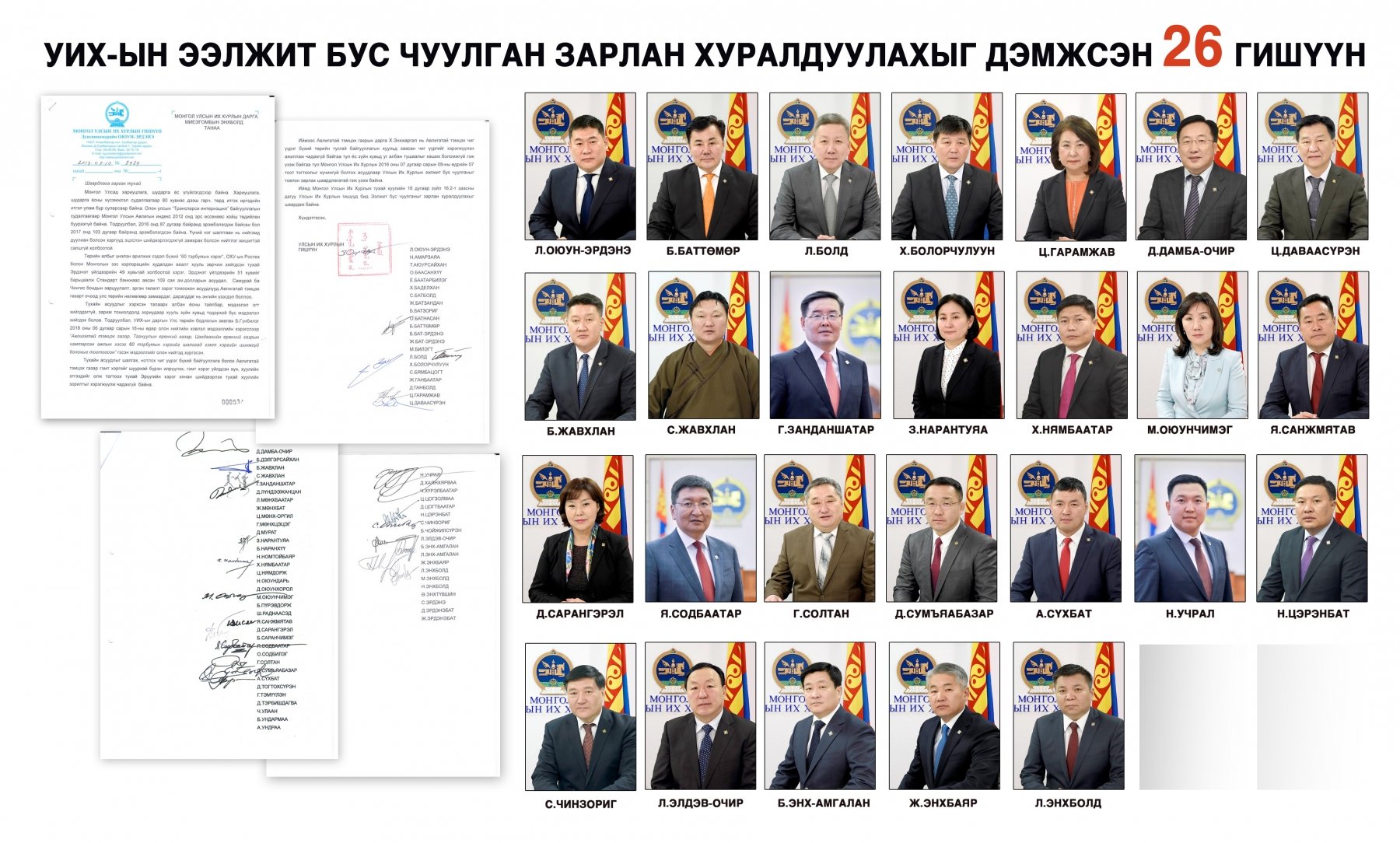 Харин өчигдөр УИХ-ын гишүүн Л.Оюун-Эрдэнэ УИХ-ын даргад хандаж хугацаатай мэдэгдэл хүргүүлж, гарын үсэг зурсан 26 гишүүний нэрсийг сэтгүүлчдэд дэлгэсэн билээ.