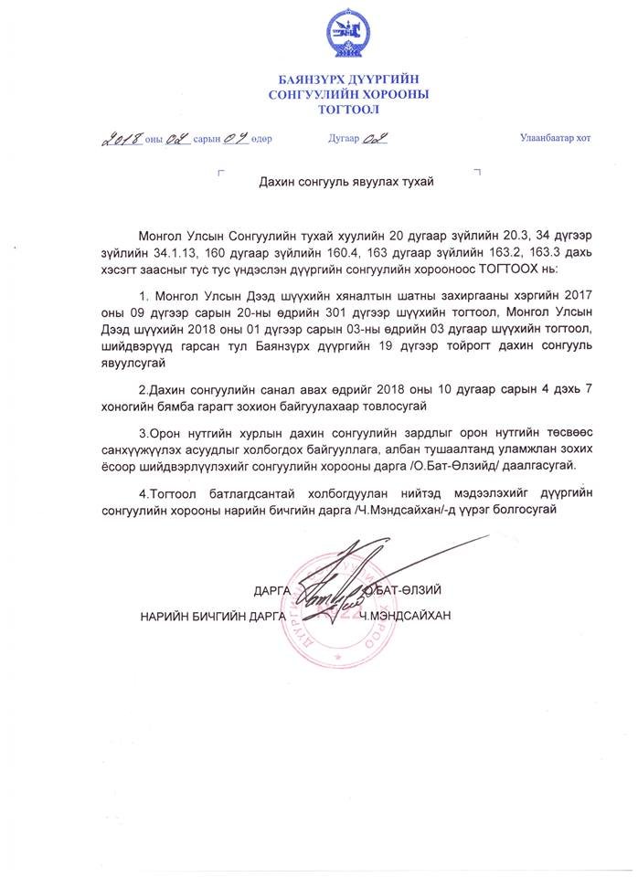 Тодруулбал, өнгөрөгч оны 9 сарын 20-ны өдөр Монгол Улсын Дээд шүүхийн хяналтын шатны захиргааны шүүхийн 301-т тогтоол болоод энэ оны 1-р сарын 3-ны өдөр Монгол Улсын Дээд шүүхээс гаргасан 03-р шүүхийн тогтоол, шийдвэрийн дагуу тус дахин сонгуулийн товыг гаргаад байна.