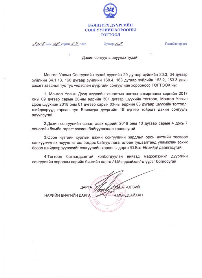 Баянзүрх дүүргийн сонгуулийн хорооноос дахин сонгуулийн товыг зарлажээ. Тодруулбал: Монгол Улсын дээд шүүхийн 2017 оны 9 дүгээр сарын 20-ний өдрийн 301 дүгээр тогтоол, 2018 оны 1 дүгээр сарын 03-ны өдрийн 03 дугаар тогтоол, шүүхийн шийдвэрүүдийг үндэслэн Баянзүрх дүүргийн 19 дүгээр тойрогт дахин сонгууль явуулахаар шийдвэрлэсэн байна. Дахин сонгуулийн энэ оны 10 дугаар сарын 4 дэх долоо хоногийн бямба гарагт зохион байгуулах болсон аж. Мөн түүнчлэн сонгуульд шаардагдах зардлыг орон нутгийн төсвөөс санхүүжүүлэх шийдвэрийг тус дүүргийн сонгуулийн хороо шийдвэрлэжээ.