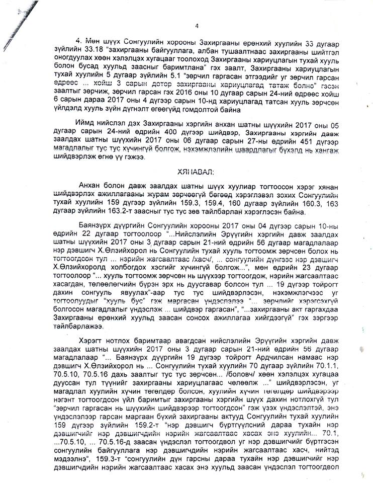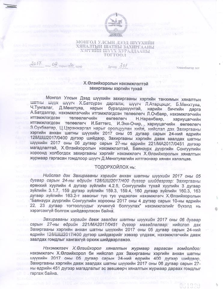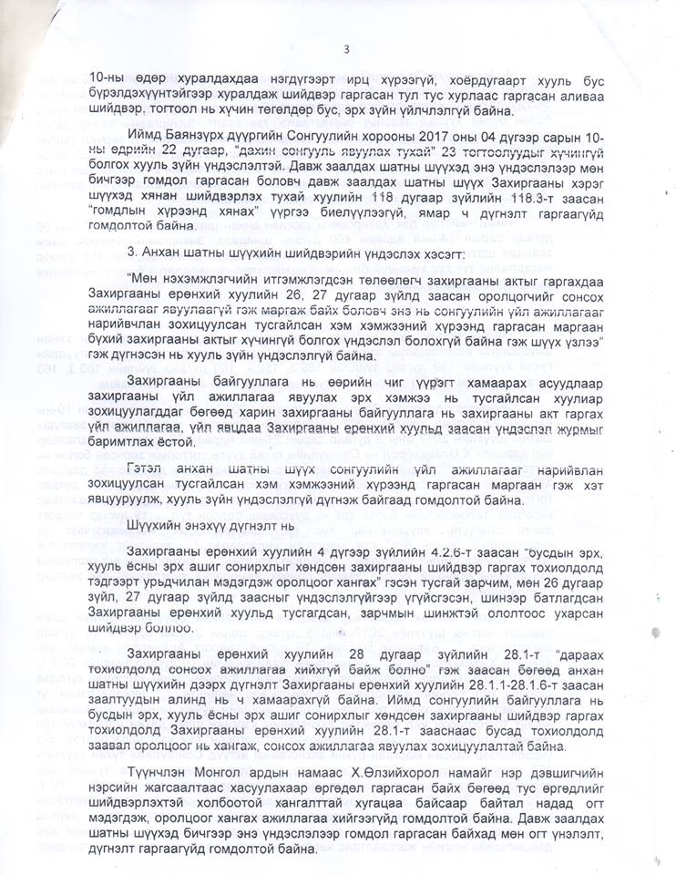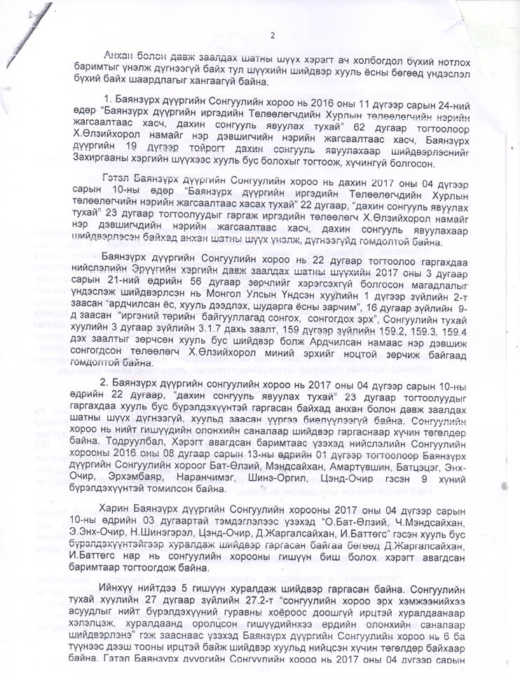 Үндсэндээ бол Баянзүрх дүүргийн сонгуулийн 10 болон 19 дүгээр тойрогт болсон сонгуулийн маргаан удтал үргэлжилж, гурван ч шатны шүүхээс дахин сонгууль явуулах шийдвэрийг гаргаад байгаа. Энэ дагуу Баянзүрх дүүргийн сонгуулийн хорооноос дахин сонгуулийг ирэх аравдугаар сарын 27-нд явуулах товыг зарлаад байна.