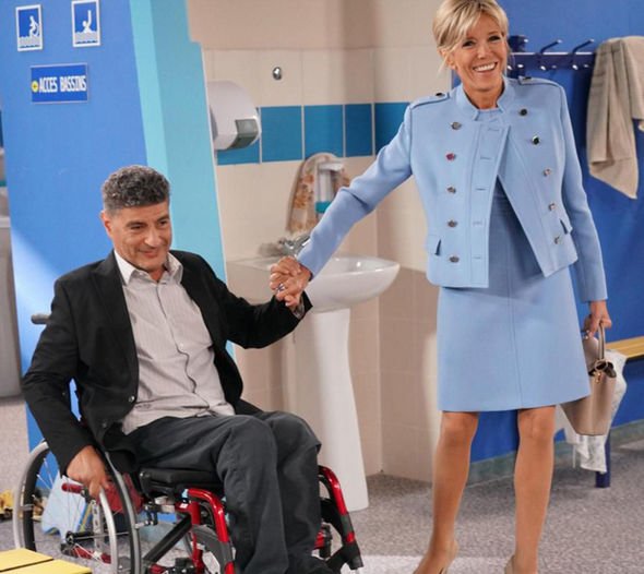 Францын тэргүүн хатагтай кино зураг авахуулахдаа цэнхэр тэнгэрийн өнгөтэй костюм өмсчээ. Тэрбээр энэ хувцастайгаа 2017 оны 5 дугаар 14-нд болсон нөхрийнхөө тангараг өргөх ёслолд оролцож байсан юм.