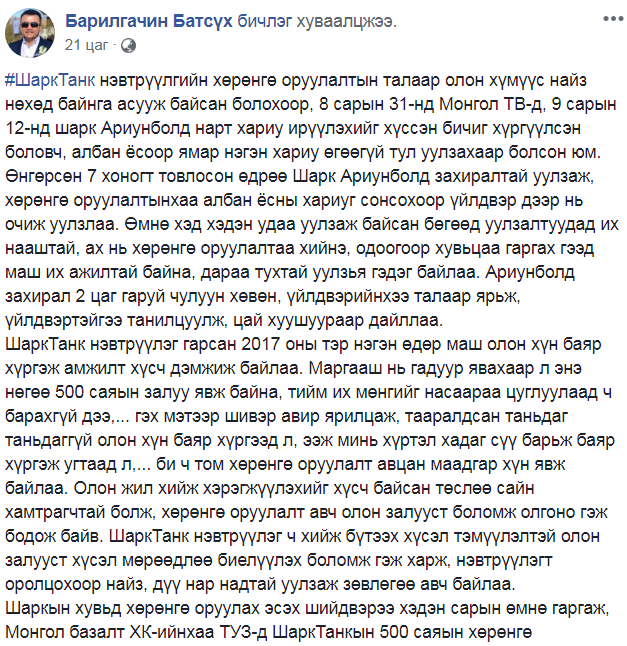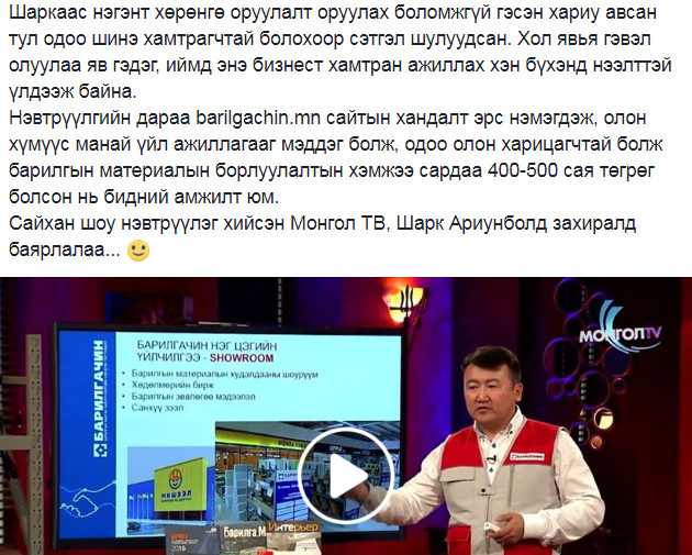 Өнгөрсөн жил "Mongol HD” телевизээс зохион байгуулсан "Шарк Танк” нэвтрүүлэгт Барилга.мн сайтыг үүсгэн байгуулагч С.Батсүх оролцож 500 сая төгрөгийн хөрөнгө оруулалт авахаар болсон. Тодруулбал, "Онлайн барилгын зах" төслөөр нэвтрүүлэгт оролцож "Монгол базальт” компанийн Ерөнхий захирал Л.Ариунболд дэмжсэнээр хамтарч ажиллахаар болсон. Гэвч харамсалтай нь уг нэвтрүүлгээс хойш жил гаруй хугацаа өнгөрсөн ч ямар нэг хөрөнгө оруулалт орж ирээгүйгээр барахгүй нэвтрүүлгийн үед тохиролцсон хөрөнгө оруулалтаа хийхгүй гэдэг хариулт өгчээ.