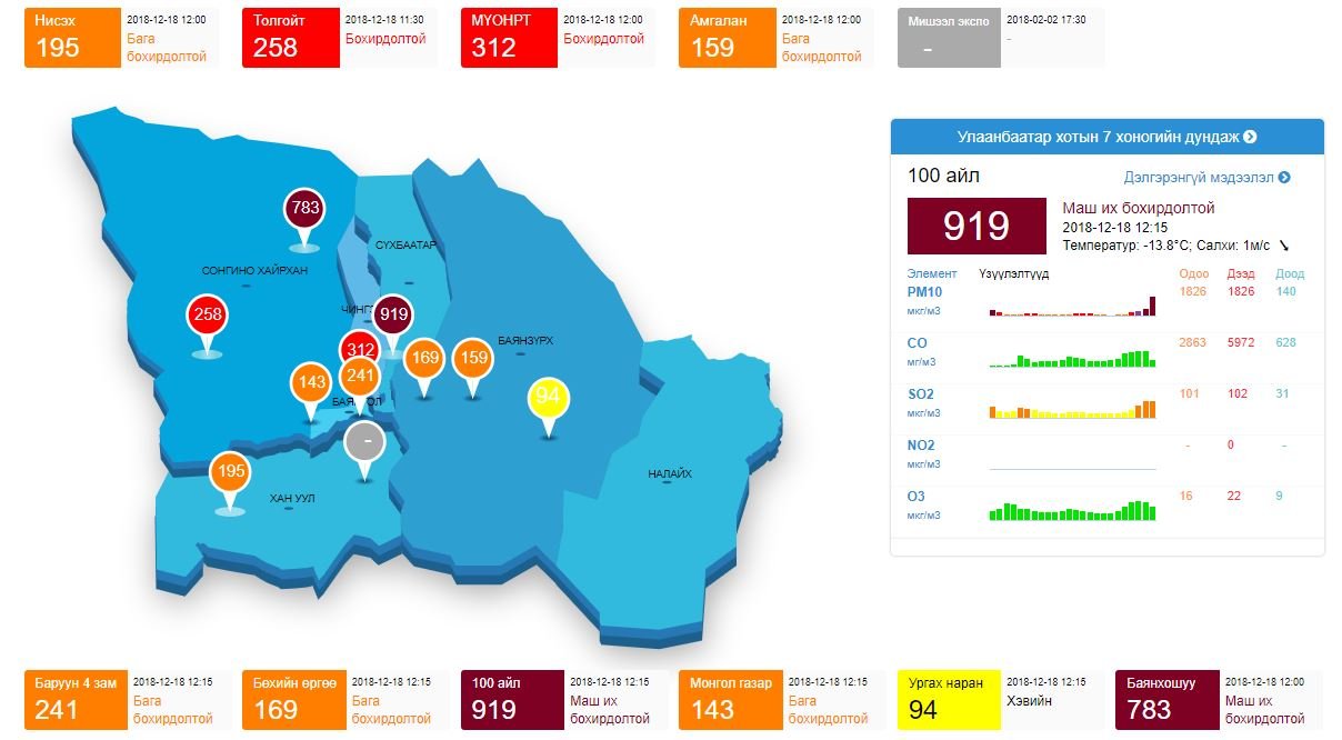 Агаарын чанарын индекс өнөөдөр 12.00 цагийн байдлаар Зуун айл орчимд 919, Баянхошуунд 783 зааж байна.