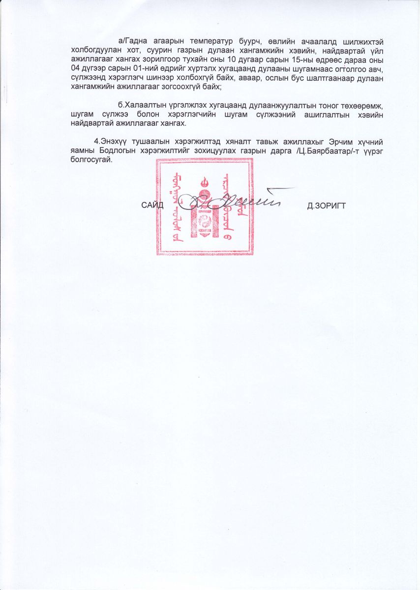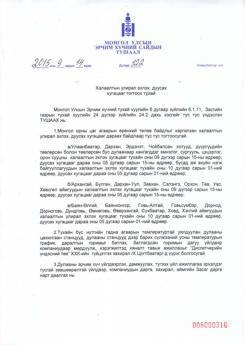 Монгол Улсын Эрчим хүчний тухай хуулийн 6 дугаар зүйлийн 6.1.11, Засгийн газрын тухай хуулийн 24 дүгээр зүйлийн 24.2 дахь хэсгийг тус тус үндэслэн Монгол Улсын Эрчим хүсний сайдын гаргасан "Халаалтын улирал эхлэх, дууусах хугацааг тогтоох тухай" 2015 оны есдүгээр сарын 14-ний өдрийн 122 тоот тушаалын дагуу Улаанбаатар, Эрдэнэт, Чойбалсан хотуудад энэ сарын 15-наас төвлөрсөн болон төвлөрсөн бус дулаанаар хангагддаг эмнэлэг, сургууль, цэцэрлэг, орон сууцны халаалтыг төлөвлөгөөт хугацааны дагуу өгч эхлэсэн.