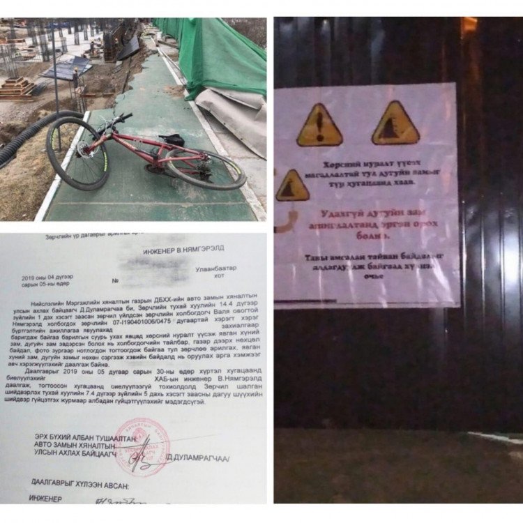 ХУД-ийн 15-р хорооны нутаг дэвсгэрт явагдаж буй барилгын бэлтгэл ажлын үеэр дугуйн зам эвдэрсэн талаар мэдээлэл хэд хэдэн сайтуудад нийтлэгдсэн. Үүний дагуу тус барилга барьж буй компаниас тодруулга хийхэд барилгын ажлын үеэр хөрсний нуралт үүссэний улмаас дугуйн зам эвдэрсэн бөгөөд Нийслэлийн Мэргэжлийн хяналтын газраас энэ оны 5-р сарын 30-ыг хүртэл дугуйн замыг сэргээх үүрэг өгсөн байна. Барилга гүйцэтгэгч компани тус үүрэг даалгаврыг цаг тухайд нь биелүүлэхээр ажиллаж байгаа бөгөөд 4-р сарын 28-ны дотор сэргээн засварлахаа мэдэгджээ.