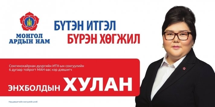 Тэгвэл УИХ-ын дарга, Ерөнхий Сайд, МАН-ын дарга асан, УИХ-ын гишүүн М.Энхболдын охин Нийслэлийн Гэр Бүл, Хүүхэд, Залуучуудын Газрын дэд дарга Э.Хулан УИХ-д бус НИТХ-ын сонгуульд нэр дэвших гэнэ.