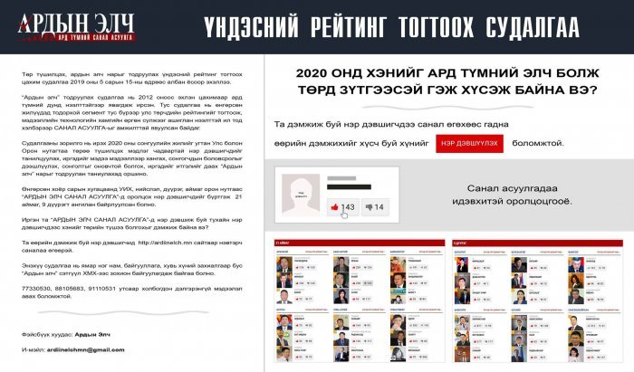 Энэхүү судалгаа нь нам, байгууллага, хувь хүний захиалгаар бус "Ардын элч” сэтгүүл ХМХ-ээс зохион байгуулагдаж байгаа болно.