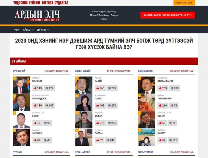 Та www.ardiinelch.mn сайтаар орж өөрийн дэмжиж буй нэр дэвшигчид саналаа өгөөрэй.
