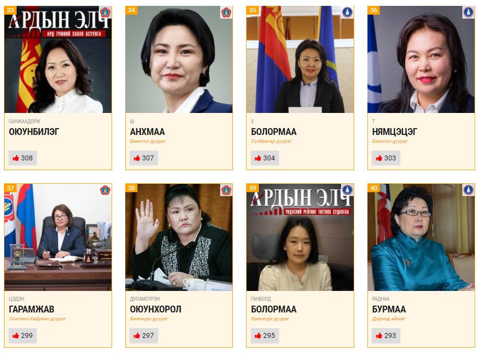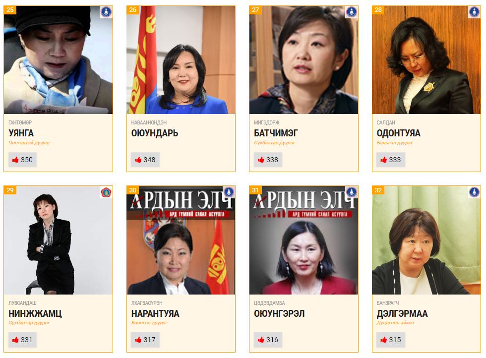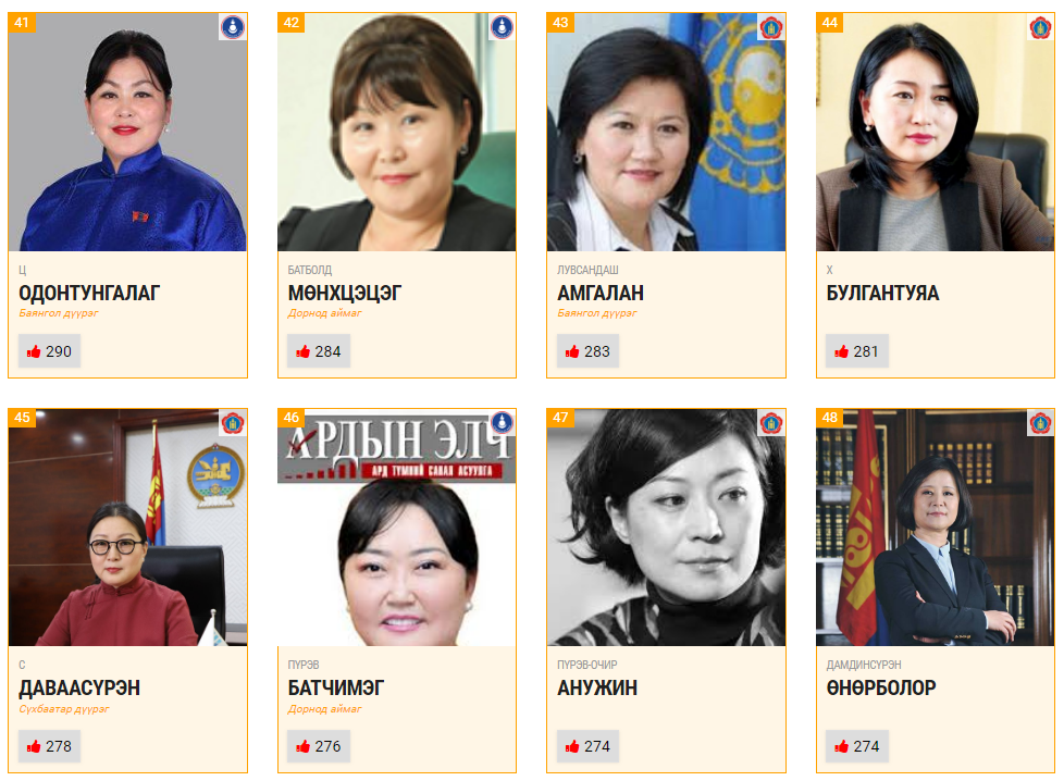 Санал асуулгад өнөөдрийн бадлаар нийт 165 хүн нэрээ дэвшүүлснээс эхний 50-д жагсаж байгаа эмэгтэй ард түмний элчүүдийг танилцуулъя.