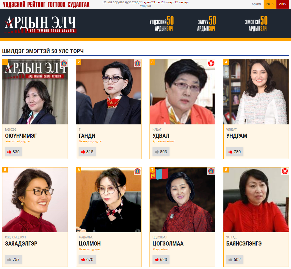 "Ardiinelch.mn”-ий шилдэг "Эмэгтэй 50" улс төрчийг тодруулах санал асуулгын явцын дүнг танилцуулж байна.
