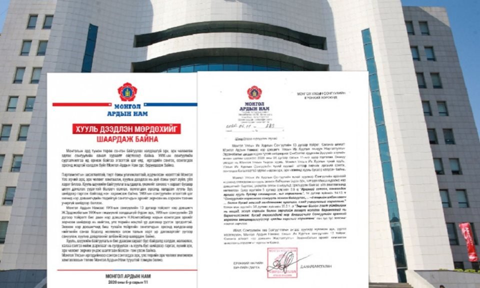 Уг шаардлагад, "Монгол Ардын намаас УИХ-ын сонгуулийн 23 дугаар тойрогт нэр дэвшигч Ж.Эрдэнэбатын УИХ-ын гишүүний халдашгүй бүрэн эрх, УИХ-ын сонгуулийн 29 дүгээр тойрогт бие даан нэр дэвшигч Н.Номтойбаяр нарын сонгогдох эрхийг зөрчсөн шийдвэр нь нийгэм, улстөрийн ноцтой үр дагавар үүсгэх эрсдэлтэй. Зөвхөн нэр дэвшигчид биш тухайн тойргийн сонгогчдын эрхэнд халдсанаар нийгмийн санаа бодолд нөлөөлөх олон талын хорт үрт дагавартайг үүгээр сануулан, хуулиа дээдлэхийг албан ёсоор шаардаж байна” гэв.