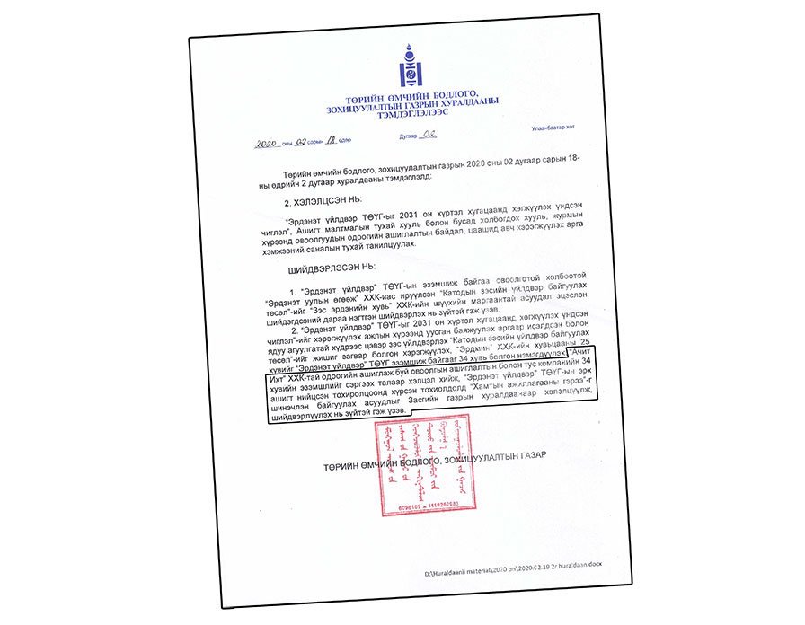Тиймээс ТӨБЗГ-ын дээрх хуралдаанаар "... "Ачит Ихт” ХХК-тай одоогийн ашиглаж буй овоолгын ашиглалтын болон тус компанийн 34 хувийн эзэмшлийг сэргээх талаар хэлцэл хийж, "Эрдэнэт үйлдвэр” ТӨҮГ-ын эрх ашигт нийцсэн тохиролцоонд хүрсэн тохиолдолд "Хамтын ажиллагаа”-ны гэрээг шинэчлэн байгуулах асуудлыг Засгийн газрын хуралдаанаар хэлэлцүүлж, шийдвэрлүүлэх нь зүйтэй гэж үзэв” гэсэн байна.
