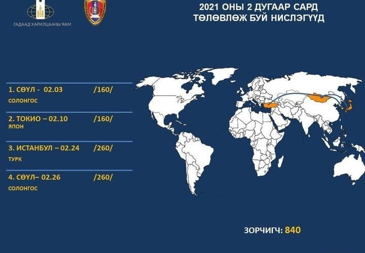 Улсын онцгой комиссоос ирэх хоёрдугаар сард дөрвөн удаагийн тусгай үүргийн нислэг үйлдэж, гадаад улс орноос эх орондоо ирэх хүсэлтэй иргэдээ татан авахаар болжээ. Үүнд: