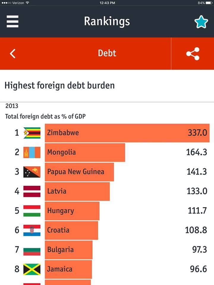 Economist сэтгүүл дээр дэлхийн бүх 215 улсаас хамгийн их Өрийн дарамтанд орсон орны жагсаалтанд бид Африкийн Зимбабвэгийн дараа бичигдсэн байна.