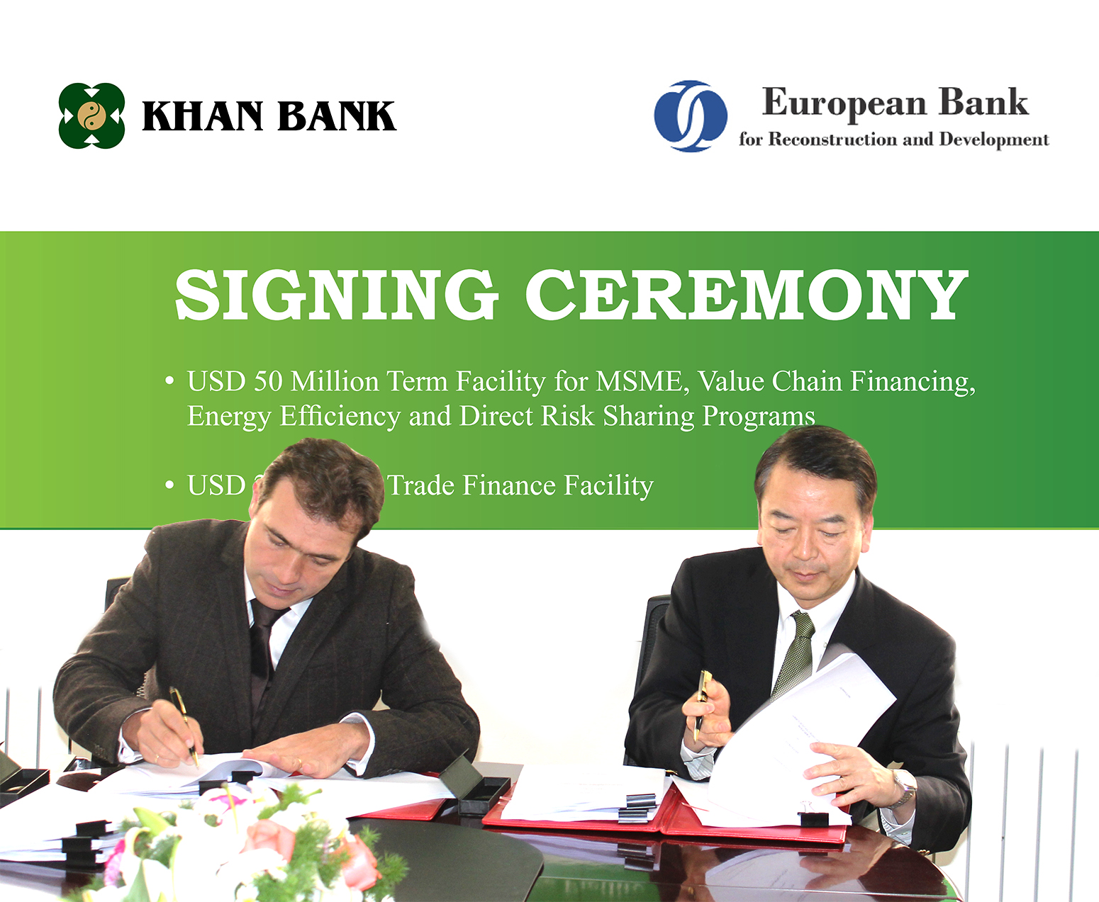 Зээлийн багц гэрээнд гарын үсэг зурах ёслолд ХААН Банк болон EСБХБ-ны удирдлагын төлөөлөл оролцож , EСБХБ-ны төлөөлж Монгол дахь Суурин төлөөлөгч Матю Дэ Лэ Блан болон ХААН Банкыг төлөөлж Гүйцэтгэх захирал Норихико Като нар гэрээнд гарын үсэг зурж баталгаажууллаа.