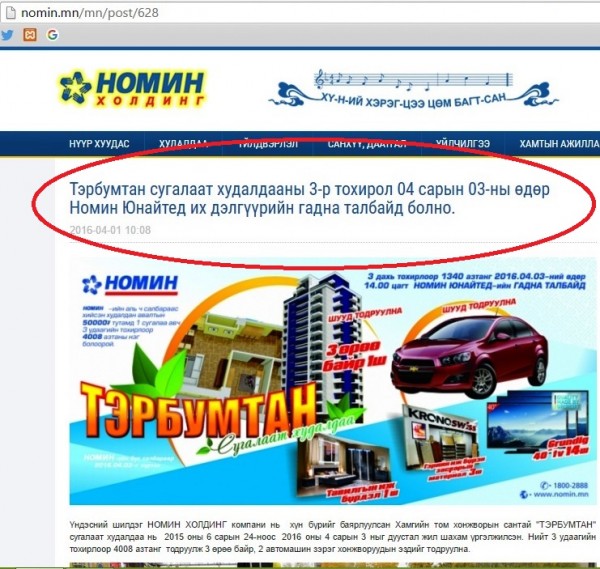 Монголдоо л томоохон сүлжээ дэлгүүрийн тоонд зүй ёсоор ордог Номин их дэлгүүр худалдан авагчдын дунд сугалаат худалдааг явуулдаг болоод багагүй хугацааг өнгөрүүлж байна. НОМИН ХОЛДИНГ компанийн зарладаг Хамгийн том хонжворын сантай гэх "ТЭРБУМТАН” сугалаат худалдаа нь 2015 оны 6 сарын 24-ноос өнөөдрийг хүртэл жил шахам үргэлжилэн, нийт 3 удаагийн тохирлоор 4008 азтанг тодруулж 3 өрөө байр, 2 автомашин зэрэг супер хонжворуудыг азтануудад олгохоор болжээ.
