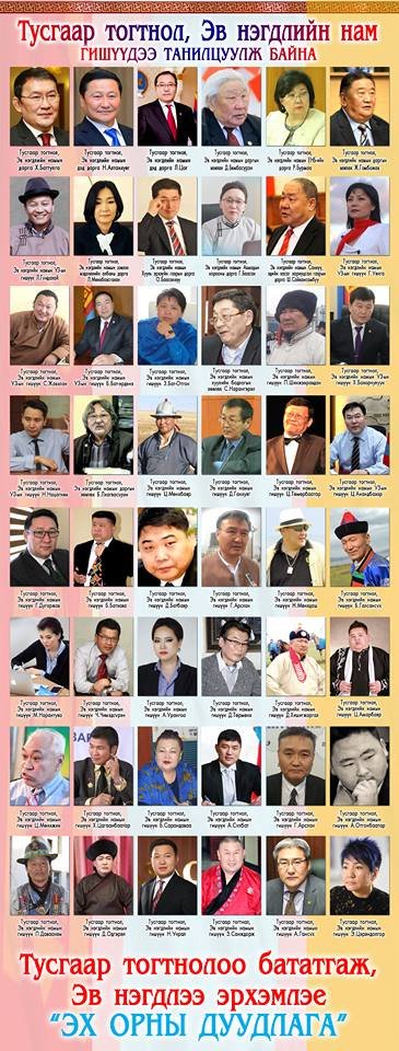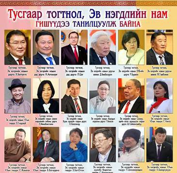 Монголын нэр бүхий улс төрчид нэгдсэн тус намд урлаг соёл, спорт, яруу найрагчид гэх мэт нөлөө бүхий эрхмүүд мөн элсэж намыг өнгөлжээ.