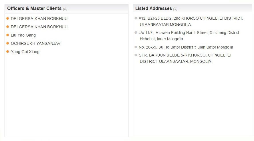 Тэрбээр "Wisdom International Holdings" гэх компанийн нэрээр бүртгэлтэй Янсанжавын Очирсүх, "Eiffel View Universal Holdings" гэх нэрээр бүртгэлтэй Борхүүгийн Дэлгэрсайхан гэх Монгол Улсын иргэн бүртгүүлжээ.