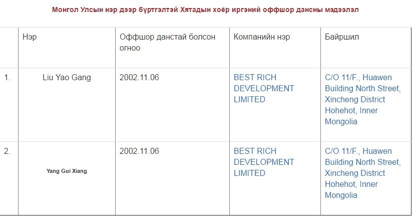 Түүнчлэн "Panama Papers"-ээс хятад эзэнтэй хоёр монгол компани оффшор данстайг зарлаад байна.Улмаар Монгол Улсын нэр дээр бүртгэлтэй Хятадын хоёр иргэн, Өвөр монголд болон Монгол Улсад бүртгэлтэй хоёр компанийн тухай мэдээлэл тус тус тавигдсан байна.