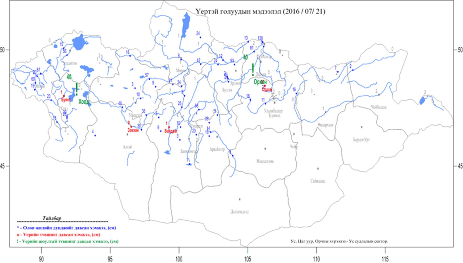 Цаг уурын байгууллагаас ирүүлсэн мэдээгээр 2016 оны долоодугаар сарын 22-ны өдөр төв болон зүүн аймгуудын ихэнх нутгаар, 23-ны өдөр төв болон зүүн аймгуудын ихэнх нутгаар, 24-ний өдөр баруун аймгуудын нутгаар, 25-ны өдөр баруун болон төвийн аймгуудын ихэнх нутгаар дуу цахилгаантай бороо орох төлөвтэй байна.