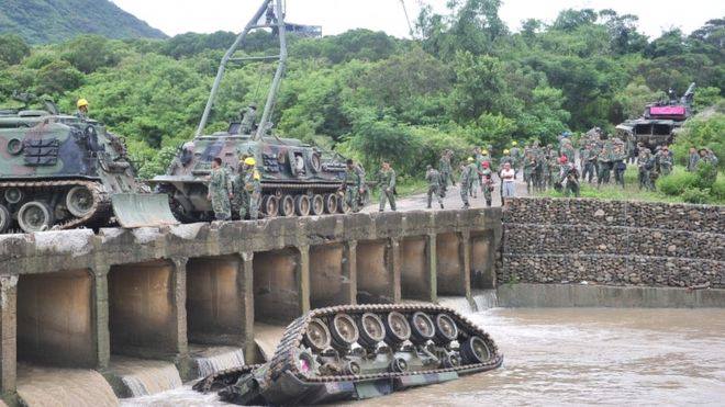 Си Эм 11 хуягт танк ширүүн бороо орох үед гүүрээр гарах гэж байгаад Пиндун хотын Вангша голд унасан байна. Танкинд сууж явсан 5 цэрэг цэргийн хуаран руугаа буцаж явж байжээ. Танкны жолооч болон ахмад нь амьд үлдсэн бол үлдсэн 3 цэрэг нь амьсгал хураасан байна. Цэргүүд наймдугаар батальоных бөгөөд ирэх 7 хоногт болох цэргийн сургуулилтын бэлтгэлийг хийж байжээ. Тайванийн ерөнхийлөгч Цаи Ин-вэн цэргүүдэд эмгэнэл илэрхийлж, ослын шалтгааныг яаралтай илрүүлэхийг шаардсан байна.
