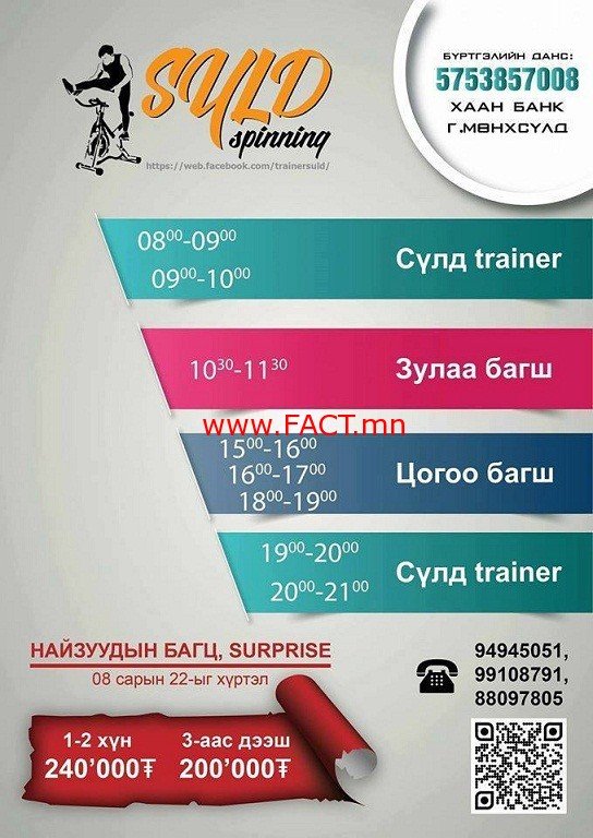 Эргэлтэд дугуйн холбооны тэргүүн "Сүлд трэйнер"-ийн удирдлаган дор хүссэн үр дүндээ хүрч, итгэл дүүрэн алхахыг хүсвэл 9494-5051, 9910-8791, 8809-7805 утасаар холбогдоорой.
