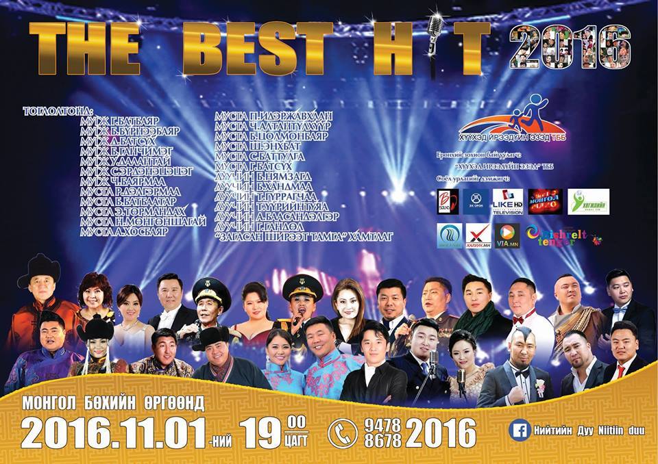 Жил жилийн өнгийг тодорхойлох нэг зүйл бол уран бүтээлчдийн тоглолт байдаг гэхэд нэг их буруудахгүй биз. Тэгвэл энэ оны хаалтын тоглолт удахгүй бөхийн өргөөнд болох гэж байна."THE BEST HIT-2016” нэртэй Нийтийн дуучдын уг тоглолт нь нийгэм рүү хандаж байгаагаараа онцлог юм. Тодруулбал арваннэгдүгээр сарын 1-нд болох тоглолтын орлого "Хүүхэд ирээдүйн эзэд” ТББ-ын сайн үйлсийн аянд зориулагдах аж. Монгол Улсын гавьяат жүжигчин Г.Батбаяр, У.Далантай, С.Эрдэнэцэцэг, Б.Ганчимэг, Ч.Баярмаа, Д.Батсүх, Б.Бүрнээбаяр тэргүүтэй уран бүтээлчид нэгдэн энэхүү тоглолтод ая дуугаа өргөх юм байна. "THE BEST HIT-2016” тоглолт ганцхан удаа тоглогдох бөгөөд тасалбарыг бөхийн өргөөны кассаар борлуулж байгаа аж. Ийнхүү олон сайхан үйл явдал, баярт мэдээ, шинэ уран бүтээл төрүүлсэн 2016 оныг уран бүтээлчид маань"THE BEST HIT-2016” тоглолтоороо хааж байгаа бөгөөд тоглолтын орлогоор "Хүүхэд ирээдүйн эзэд” ТББ-ын зүгээс 1000 хүүхдэд бэлэг авч өгөх,мөн өрх толгойлсон эхчүүд болон өнчин хүүхдүүдийн хичээлийн хэрэглэл, өвлийн хувцасыг бэлдэж өгөх ажил зохион байгуулах аж.