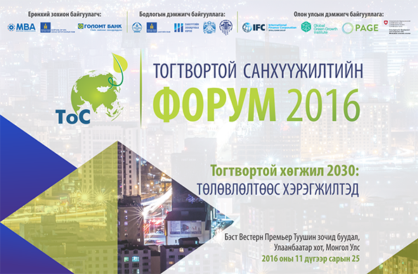 Монголын Банкны Холбоо (МБХ), Байгаль орчин, аялал жуулчлалын яам (БОАЖЯ) хамтран "Монгол Улсын Тогтвортой санхүүжилт (ТоС)-ийн Форум 2016” арга хэмжээг 2016 оны 11 дүгээр сарын 25-ны өдөр Бэст Вестерн Премьер Туушин зочид буудалд 08:30-16:30 цагийн хооронд зохион байгуулах гэж байна. Энэ жилийн Форум БОАЖЯ, Сангийн яам, Ерөнхий сайдын ажлын алба, Эдийн засгийн байнгын хорооноос зохион байгуулж буй "Тогтвортой хөгжил 2030: Төлөвлөлтөөс хэрэгжилтэд” үндэсний чуулганы нэг хэсэг болж зохион байгуулагдаж буйгаараа онцлогтой болж байгаа бөгөөд Форумыг Голомт банк, Монголбанк, Сангийн яам, СЗХ, НЗД, МҮХАҮТ, Олон улсын санхүүгийн корпараци (IFC), Даян дэлхийн ногоон хөгжлийн байгууллага (GGGI), Ногоон эдийн засгийн төлөөх түншлэл (PAGE), Тогтвортой хөгжлийн боловсрол төсөл (ESD) зэрэг байгууллагууд хамтран зохион байгуулахаар ажиллаж байна.