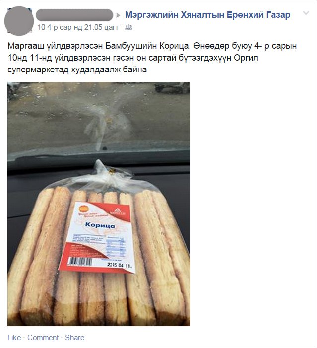Энэ сарын 10-ны өдөр "Оргил супермаркет”-аас худалдаж авсан "Бамбууш” компанийн "Корица” нэрийн гурилан бүтээгдэхүүн 2015 оны 4-р сарын 11 өдөр үйлдвэрлэгдсэн гэсэн тэмдэглэгээтэй байсныг худалдан авагч мэргэжлийн хяналтын газраар шалгуулахыг хүсжээ.