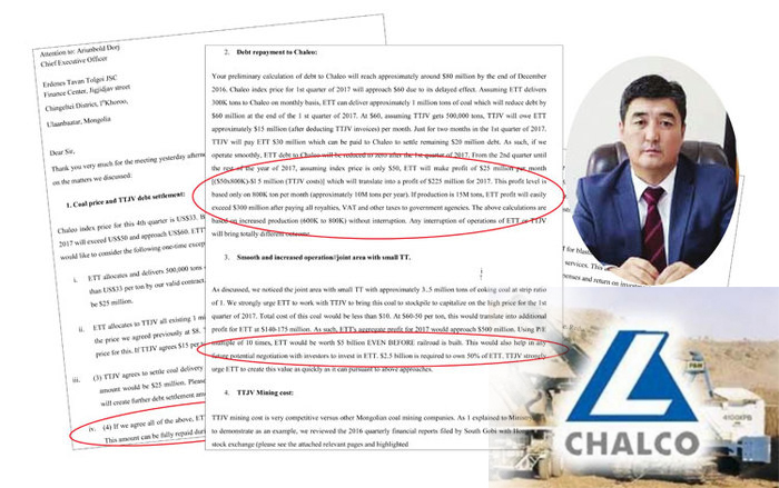 Гэхдээ Тавантолгойн 49 хувийг 400 сая ам.доллараар худалдах яриатай зэрэгцэн "Эрдэнэс-Тавантолгой” компанийн гүйцэтгэх захирал Д.Ариунболдод Хятадын "TTJV”-ээc нэгэн захидал хүргүүлсэн байх юм. "TTJV” нь анх Австралийн Макмахон компанийн охин компани байсан ч сүүлд Хятадын юомпанид хувьцаагаа худалдан шилжүүлсэн байдаг. Өдгөө "TTJV” нь "Эрдэнэс-Тавантолгой” компанийн гэрээт олборлогчоор ажилласныхаа хөлсөнд Тавантолгойн ордоос нүүрс авч хил давуулан зарж буй.