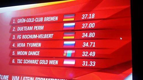 Тэмцээний нэг, дөрөвдүгээр байрт Германы баг, хоёр гуравдугаар байрт ОХУ-ын баг тус тус шалгарсан байна. Манай бүжигчид зургаадугаар байр эзэлснээр Дэлхийн аварга шалгаруулах тэмцээний финалийн шатанд үлдсэн шилдэг анхны Ази хамтлаг болсон аж. Мөн ДАШТ-нд амжилттай оролцож чансаагаараа гуравдугаарт бичигдэж бүжгийн спортын түвшинг ахиулсан байна.